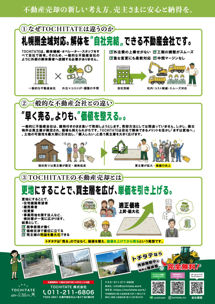 【チラシ紹介】更地にすることで「土地の価値を上げて売却」する考え。TOCHITATE! 2026 2/24 お知らせ 2026年2月24日 解体は本当の”適正価格”の第一歩 TOCHITATEは品位ある仕上がりをお約束します お知らせ よかったらシェアしてね! URLをコピーしました! URLをコピーしました! 【チラシ紹介】年間実績150件以上!解体から売却までTOCHITATE! 関連記事 【チラシ紹介】年間実績150件以上!解体から売却までTOCHITATE! 2026年2月1日 【解体】金額と仕上がりにこだわります!【TOCHITATE】 2025年7月11日 【不動産】札幌市南区の不動産買取・賃貸・解体などはTOCHITATEにお任せください! 2025年7月11日 【除雪】雪でお困りの大家さん!冬の除雪もお任せください!【TOCHITATE】 2025年7月11日 【買取】土地・戸建・アパートなど買取させてください!【TOCHITATE】 2025年7月3日 【どっちはお得?】建物ごと売却か?解体して売却か?【TOCHITATE】 2025年7月3日 【札幌大雪】トチタテ不動産売却なら!冬季の除雪費が無料!【自社で除雪】 2025年6月28日 【自己紹介】札幌市・南区石山のTOCHITATE(トチタテ)です! 2025年5月30日